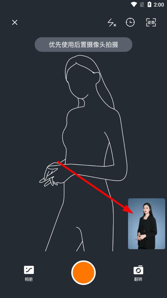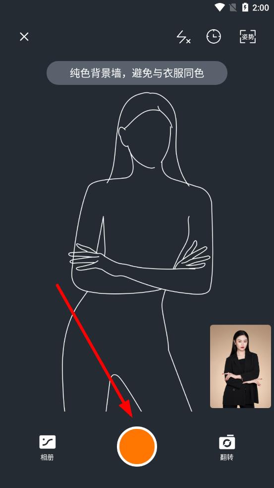 4、根据选择好的姿势线条图调整好自己的姿势后,点击界面下方的橙色拍照按钮,进行照片拍摄。