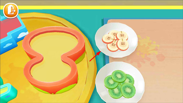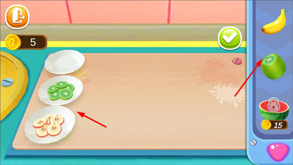 3、雪糕添加果酱之后玩家需要切一些水果放到里面,点击右侧的水果放到案板上即可。