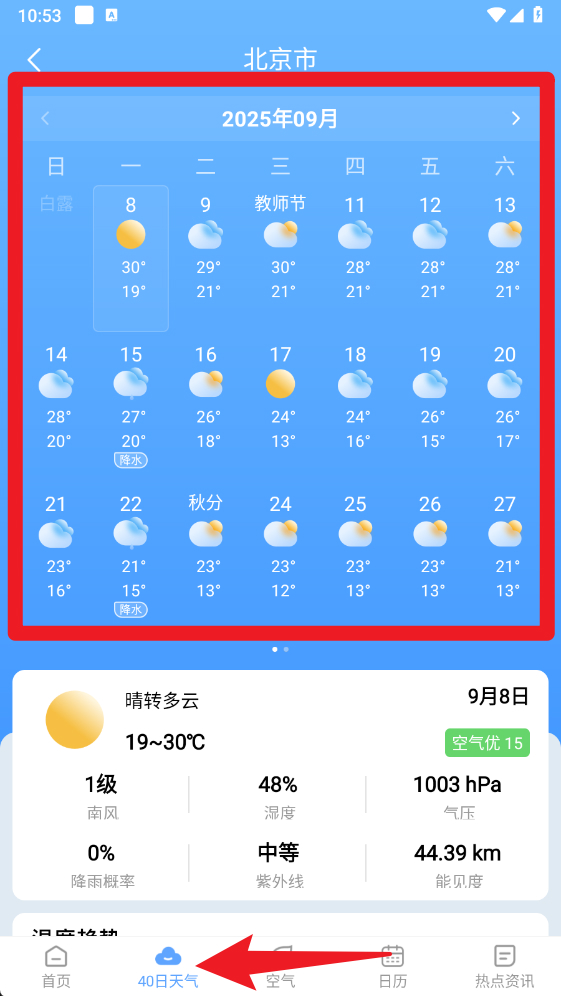 3、在【40日天气】中,可浏览未来长达40天的天气预报,包含气温范围及天气趋势。