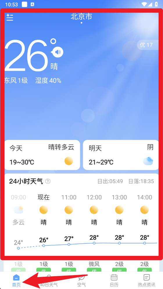 2、进入【首页】,可查看实时天气情况,包括温度、风力、湿度及未来24小时天气变化。