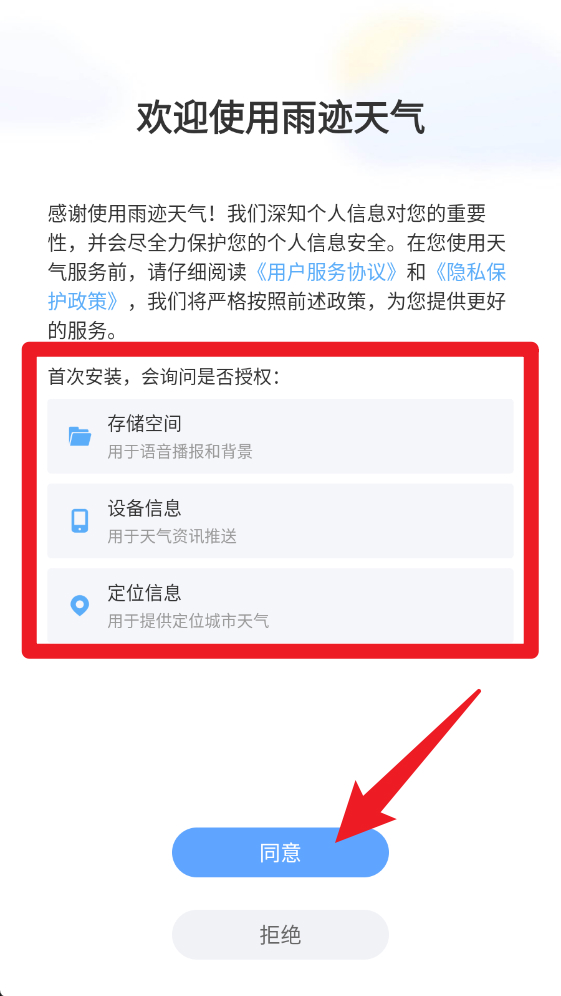 1、首次打开【雨迹天气】,会弹出《用户服务协议》和《隐私保护政策》提示,点击“同意”继续。