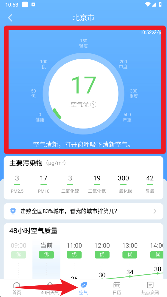 4、在【空气】栏目,可查看实时空气质量指数、主要污染物及未来48小时空气质量预测。