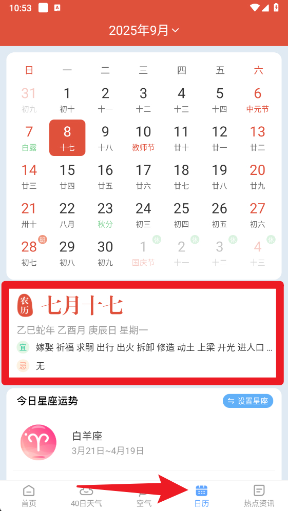 5、在【日历】中,可查看公历、农历、节气及每日宜忌事项,同时支持星座运势展示。