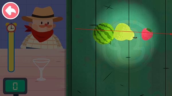 然后就会进入到切水果游戏的页面啦,每切一个水果都可以获得果汁,把左边的杯子装满之后就可以给顾客吃啦。