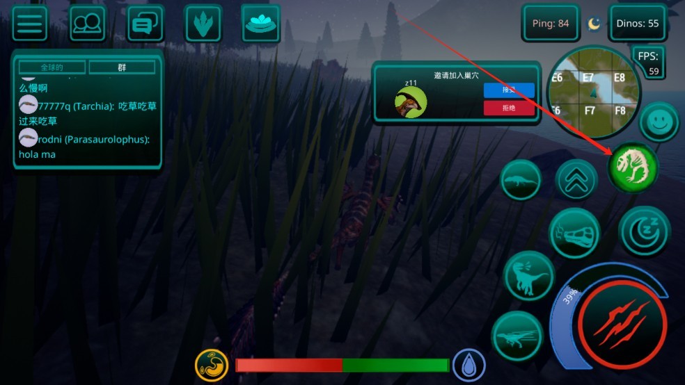 7、你可以建造巢穴,在里面养蛋,然后邀请服务器上的玩家到你的巢穴(家庭),但要做到这一点,你的恐龙必须完全长大并且你的帐户必须达到5级或更高。