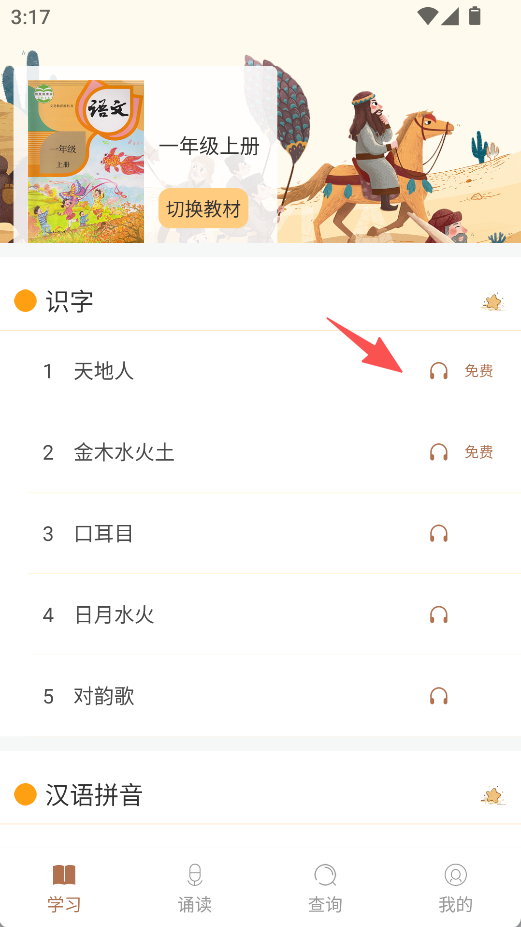 2、进入学习页面,点击识字板块里要学习内容旁的音频标识。