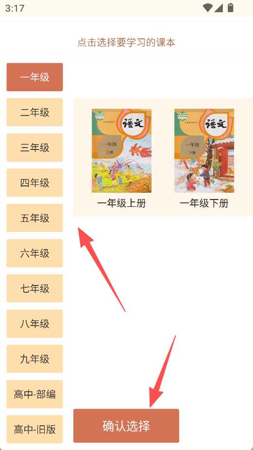 1、打开首页选择年级与对应课本,点击“确认选择”。