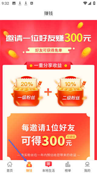 2、赚钱页面主打邀友赚钱,邀1位好友得300元,好友还能免单,有一、二级粉丝分享收益,助力用户通过邀请获利。