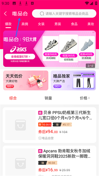 3、唯品会页面有搜索栏,分爆款、高佣等分类,展示ASICS等品牌商品,还有天天低价唯品独家板块及贝亲奶瓶等优惠品。