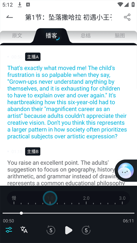有道文档FM拥有独特且实用的功能,能够将用户上传的文本或文档内容进行深度整理加工。不仅可以生成妙趣横生的双人对话播客,让学习过程不再枯燥;还能自动生成精准的总结摘要,帮助用户快速抓住重点;更能绘制清晰的思维导图,助力用户构建知识体系。通过这些功能,有道文档FM有效帮助用户提升了阅读与学习效率。