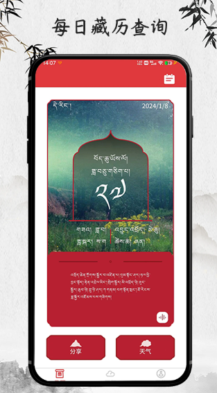 羚羊藏历天气包含藏历、公历、农历三种历法和藏历节日殊胜日等,天气预报。支持普通话、卫藏拉萨话、安多话、康巴话的语音日历信息播报,是藏族同胞们人生修行路上的好伙伴。可以藏汉语切换,藏历公历农历三种历法同时显示,殊胜节日特殊标注,便于查看。双语天气预报,语音播报每日天气,提供未来几天的天气情况,包括气温、降雨概率,风力等。因而在藏区藏族人民的实际生活中应用范围很广;帮助人们更好地安排日常活动和出行计划。
