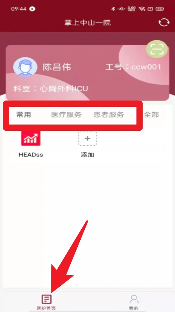 2、登录成功后会跳转到首页,点击下方“医护首页”按钮,进入常用服务页面查看快捷功能模块。
