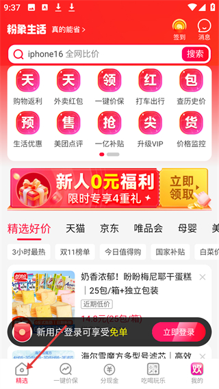 1、精选页可搜iphone16比价,有购物返利、外卖红包等功能,新人享0元4重礼,还推盼盼梅尼耶干蛋糕等精选好价商品。