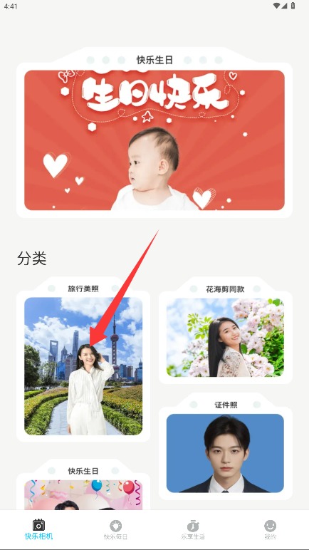 2、在功能分类中选择需要的照片类型,包括旅行纪念、证件拍摄或节日主题等模板。