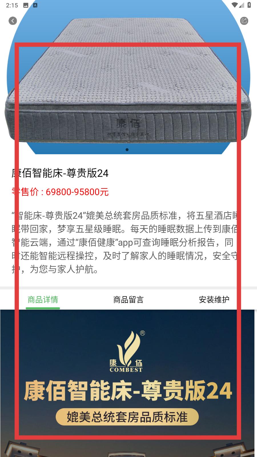 2、在智能系列产品列表,选择目标产品,如康佰智能床,点击进入该产品详情页面。