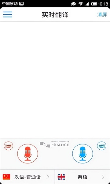 2、进入首页后,是一个很简单的页面,下面两个麦,上面就是记录屏,麦下方能选择你使用什么语言,右边是翻译的语言,其实这两个功能有点重复。