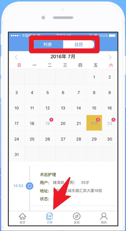 4、点击底部“订单”标签,可按列表或日历模式查看订单详情,了解服务时间与地址信息。
