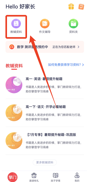 2、在首页点击教辅资料,可以查看未获得的教辅资料。