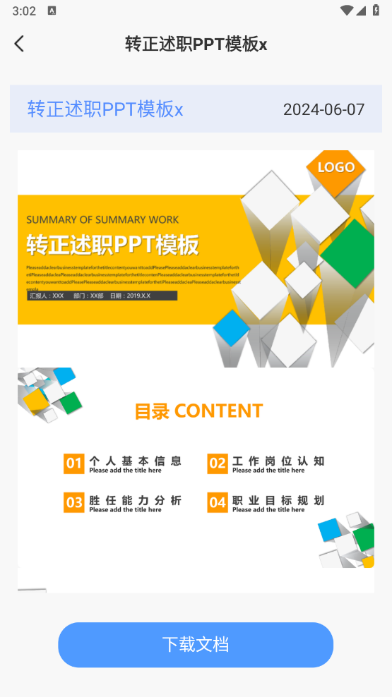 2、预览和下载:单击任意模板,进入预览界面,详细了解模板的内容和样式,确认后下载。
