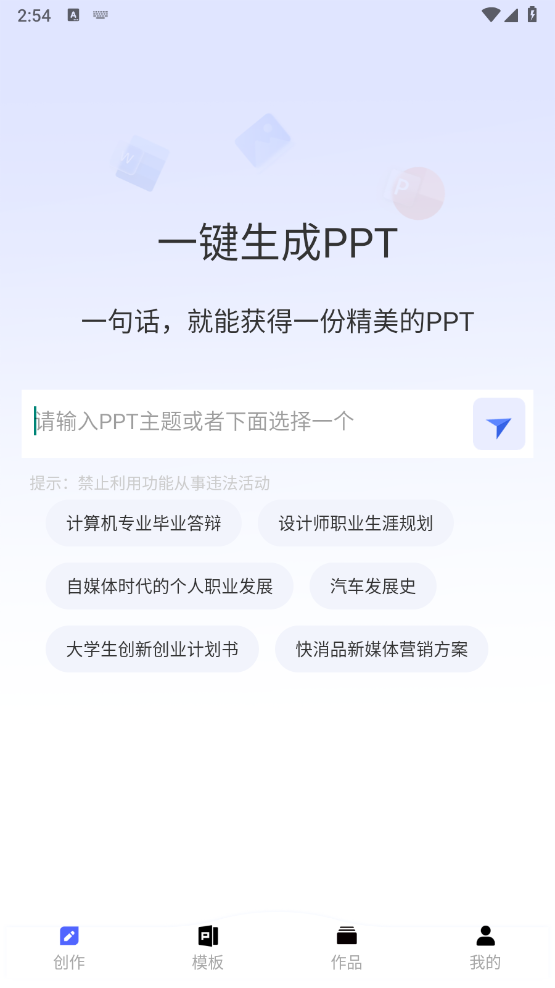 AiPPT专家是一款非常实用的效率办公软件,拥有全能的界面设计,用户可以自由进入首页中制作各种PPT,还提供多样化的PPT模板,随时随地在线应用,允许用户在线编辑调整,灵活提高办公效率,轻松享受优质的服务,还具有丰富的功能和模式,无需任何经验即可上手使用,可以帮助用户轻松保存各种PPT文件并自由管理,能完全满足所有使用需求,还支持多账号登录,可以及时同步各种PPT文档,有需求的用户欢迎下载软件。