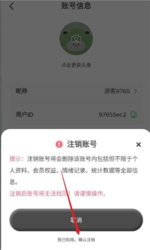3、在底部弹窗中,点击我已知晓,确认注销,即可删除数据并注销账号。