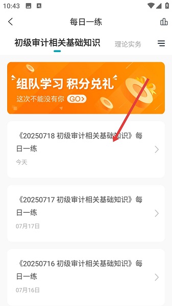 2、用户可参与组队学习积分兑礼活动,页面展示了不同日期的初级审计相关基础知识练习题目,方便用户按日期进行练习。