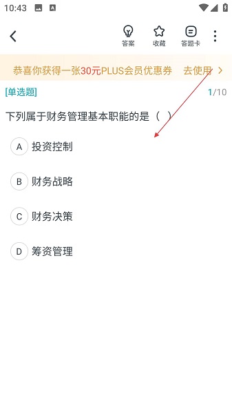 3、练习题目界面呈现了财务管理基本职能相关的单选题,用户可作答,同时还能查看答案、收藏题目或使用答题卡。