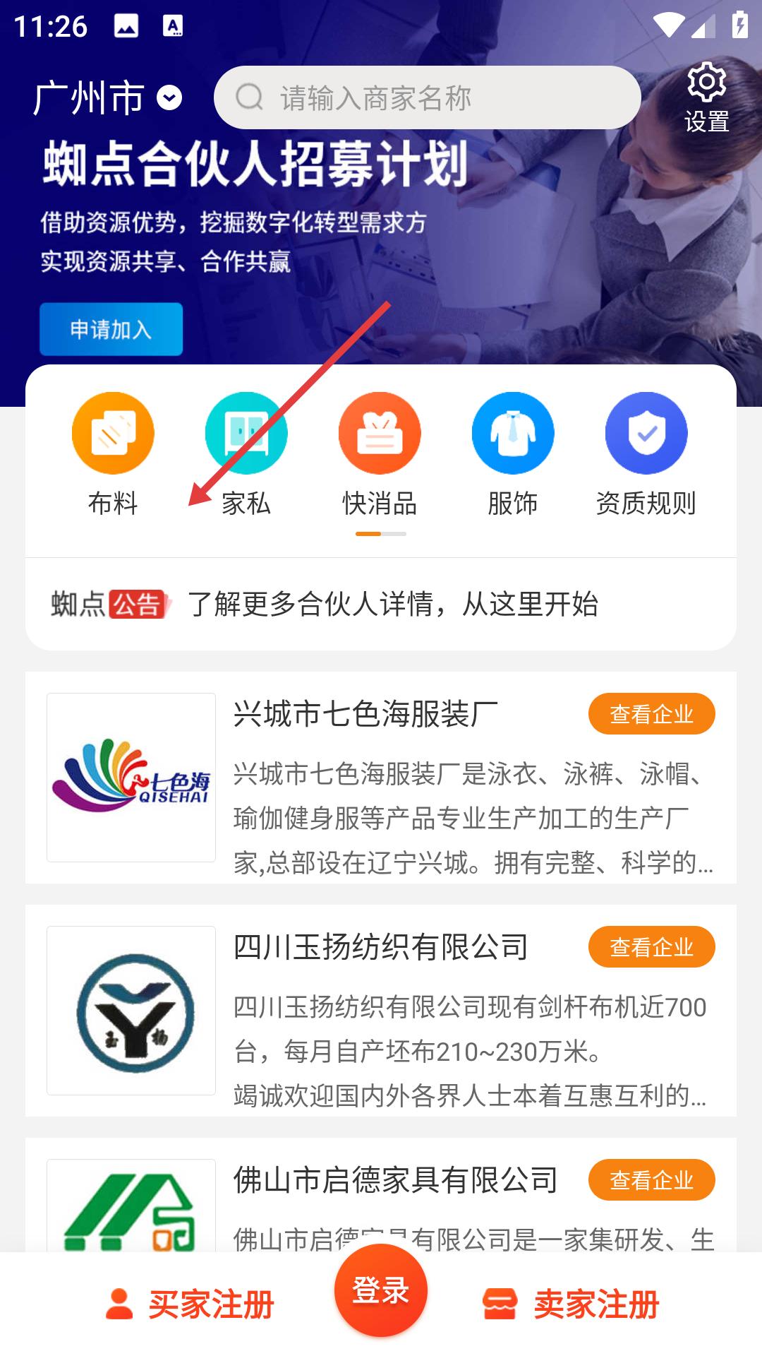 3、进入主页有蜘点招募计划,可搜商家,有布料、家私、快消品、复试等分类,展示企业信息。