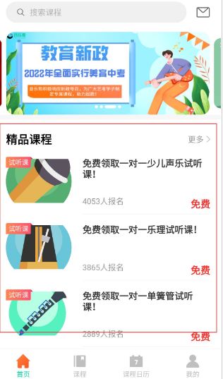 2、在首页通过搜索课程,找心仪内容,查看教育,新政相关课程,借助精品课程板块提升音乐知识技能。