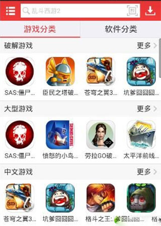 5、你也可以在分类界面,把游戏详细的分类,有破解游戏,大型游戏,中文游戏,休闲益智,选择你喜欢的游戏。
