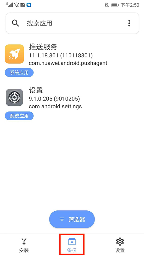 8、进入备份界面,可搜索相应的应用或者使用筛选器进行应用备份。