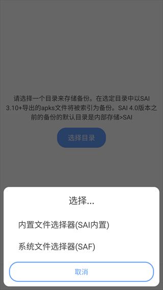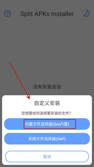 3、弹出安装提示,包括内置文件选择器(SAI内置)和系统文件选择器(SAF),用户可根据需求选择使用,这里以系统文件选择器(SAI内置)为例。