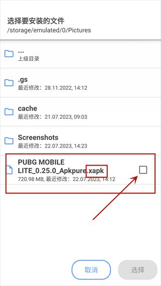 4、进入文件选择界面,搜索或者点击需要安装的文件,小编这里以pubg为例,可以看到这里有一个后缀为xapk的安装包。