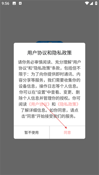 1、使用软件前务必仔细阅读【用户协议和隐私政策】,若同意其条款,点击【同意】即可开始使用服务。