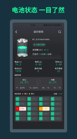 BMS软件主要功能是用于获取锂电池BMS的相关信息,可以直观的了解到锂电池的状态。通过全面掌握电池的相关信息,使电池能够稳定运行,从而更好地了解电池的状况,使用户能够轻松管理自己的电池。平台还提醒锂电池异常故障,随时提醒用户,及时查看处理,确保电池安全使用,BMSAndroid版支持用户设置电池的系统参数。 简单地设定电池参数,就能更好地使用。感兴趣的朋友不要错过下载。