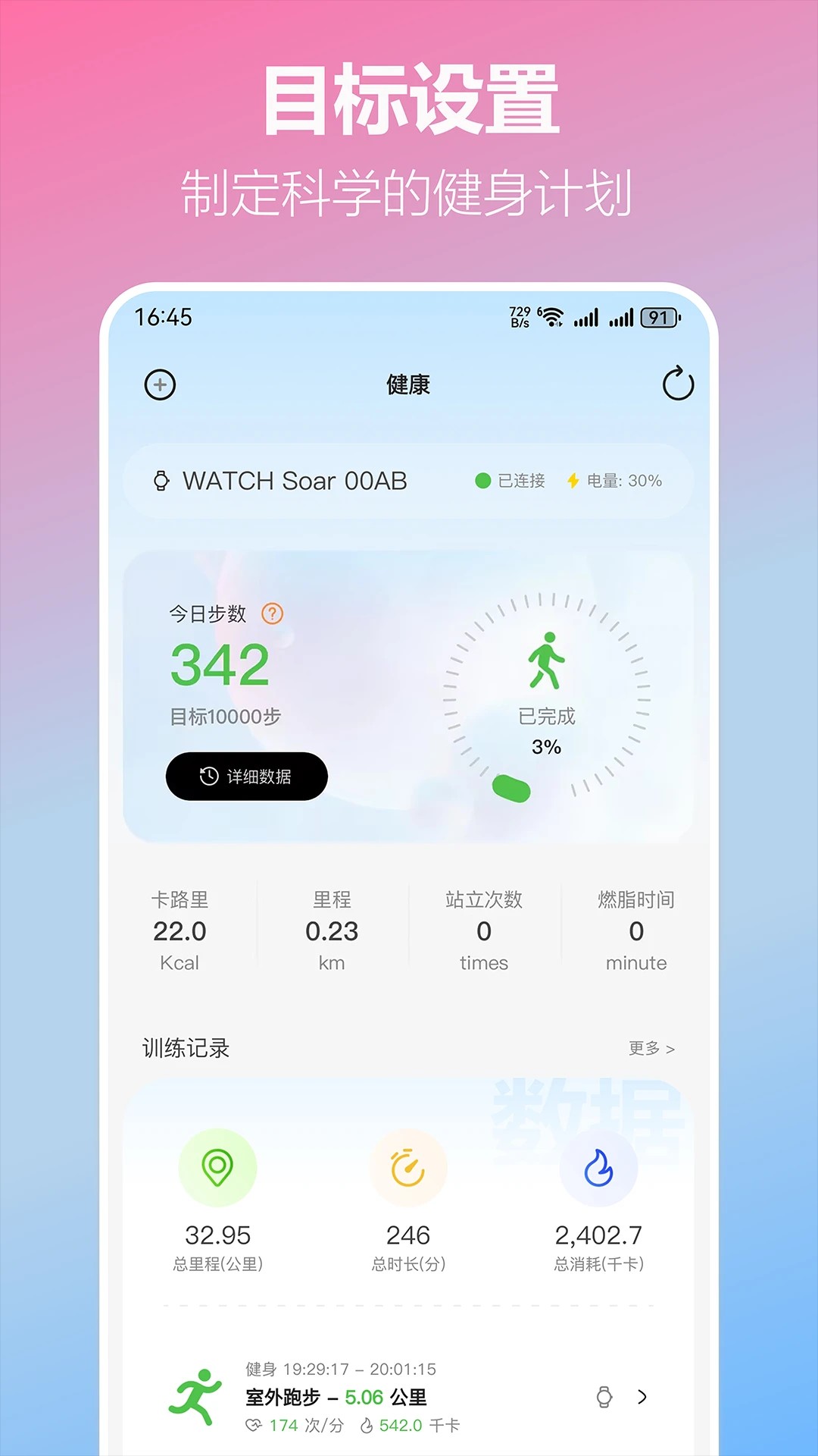 3、目标设定:根据个人需要设定健康目标,比如减肥和增肌。该应用程序将提供个性化建议和进度跟踪。
