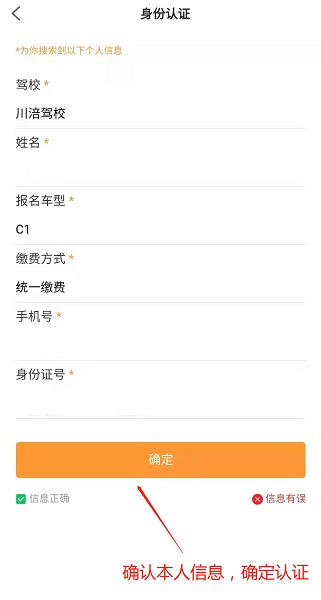 2、输入身份证号码完成绑定,核对驾校信息无误后,方能确定完成认证。