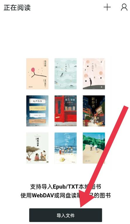 4、点击主界面的加号按钮,从手机文件夹里选择电子书文件,支持txt、epub等格式。
