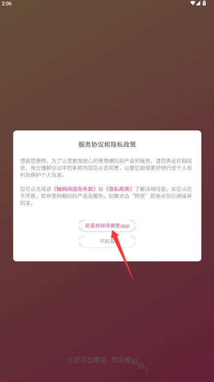 1、打开应用后仔细阅读服务协议和隐私政策,确认后点击同意并继续使用进入。