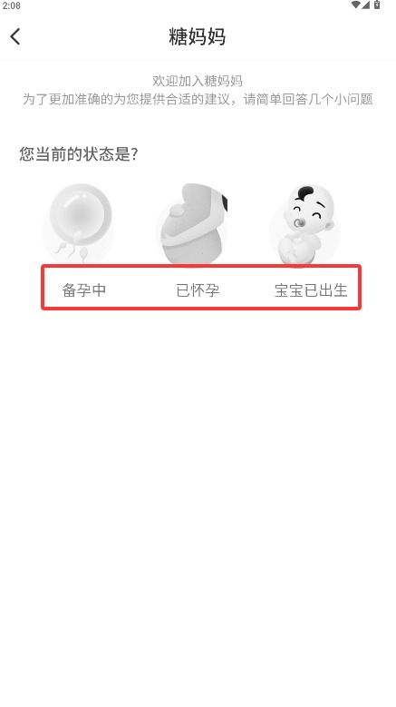 4、选择当前所处状态(备孕中/已怀孕/宝宝已出生),系统将匹配相应服务内容。