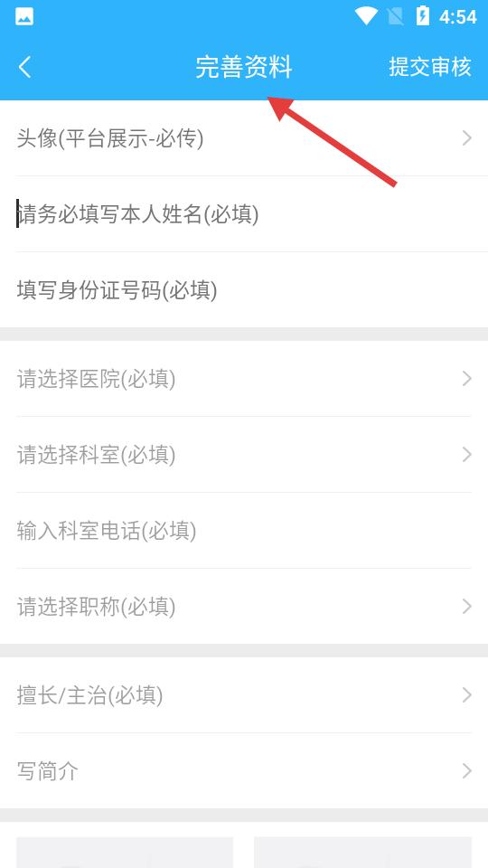 3、点击完善资料,头像、姓名等多项必填,还有医院、科室等信息待填,完成后可提交审核。