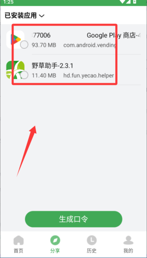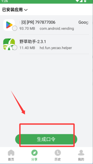 1、打开野草助手,点击下方的“分享”,然后选中要分享的app,点击生成口令。
