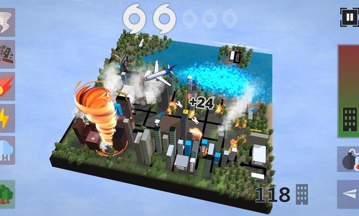 3、组合灾难以克服障碍,巧妙地绕过狡猾的防御,利用环境为你所用,制造地面坑洞以拒绝敌人占领领土,或操纵海洋引发大规模海啸,而这仅仅是个开始!在街机模式中摧毁尽可能多的建筑,释放令人惊叹的灾难。在自由的沙盒模式中创造(并摧毁)你自己的大都会。