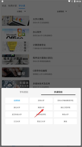3、在上方有一个全部学科以及供课院校,选择你相对应的学习课程以及学校,这里以南昌大学为例子。