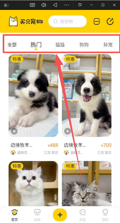 3、热门分类:猫猫、狗狗、异宠;按品种、血统、级别筛选。