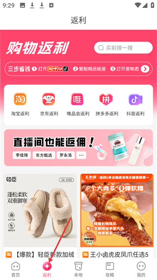 2、返利页面,有多平台返利入口,三步省钱流程,直播间可返佣,展示轻臣拖鞋、王小卤凤爪等返利商品。
