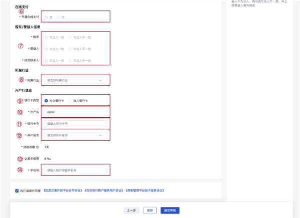勾选相关协议后,方可提交审核。点击上一步会自动保存当前页面填写内容。
