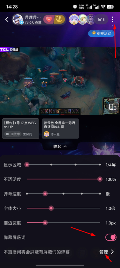 2、进入后点击右上角三个点,接着开启弹幕屏蔽词,然后点击管理。