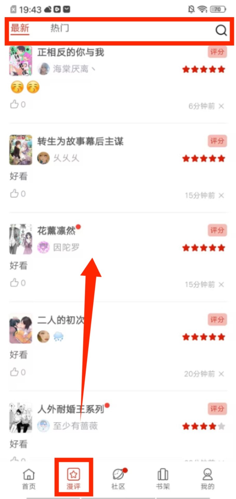 2、切换到漫评页面,在 “最新”“热门” 标签下,可查看其他用户分享的漫画评价与推荐内容。