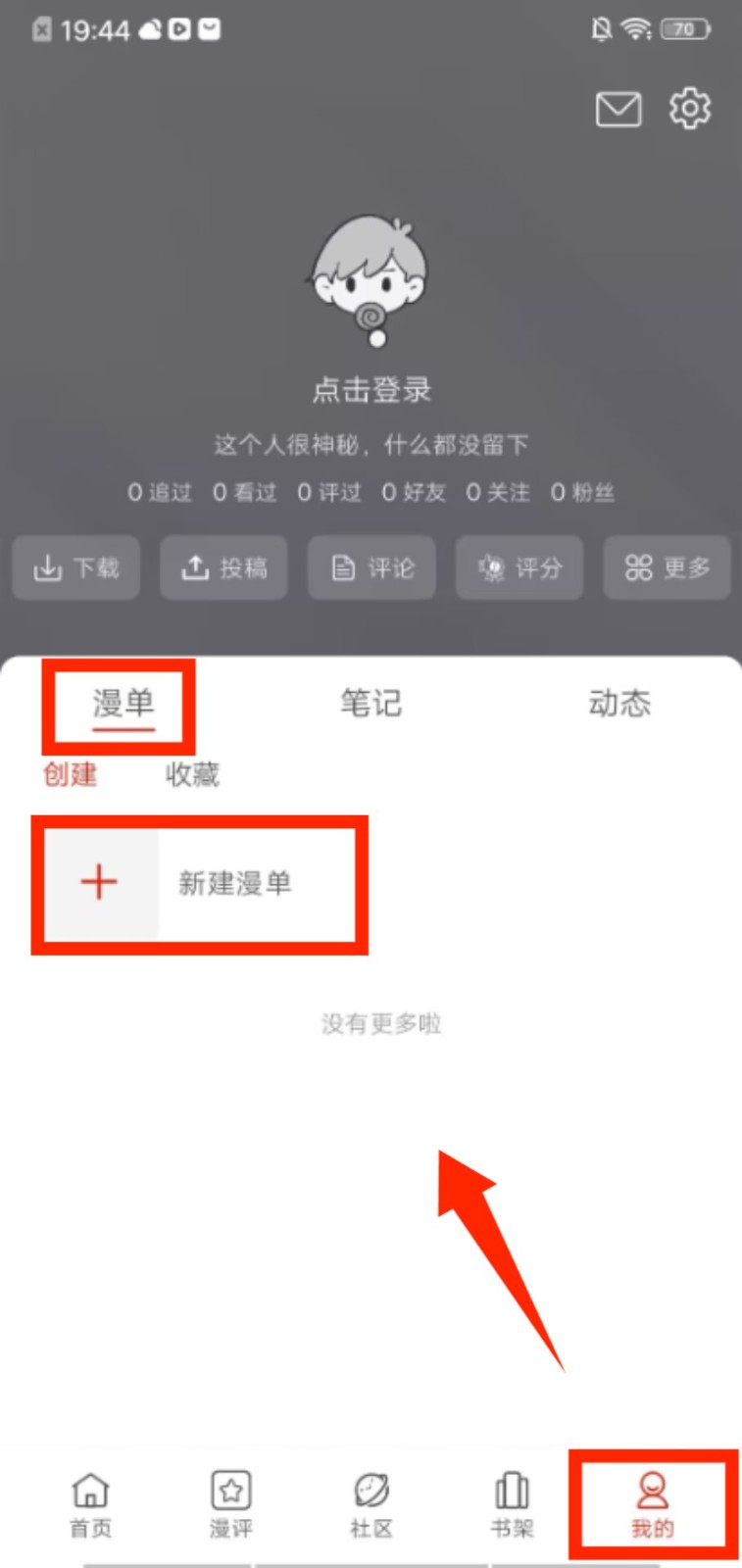 4、进入 “我的” 页面,在漫单板块点击 “新建漫单”,可创建专属的漫画收藏列表来整理作品。